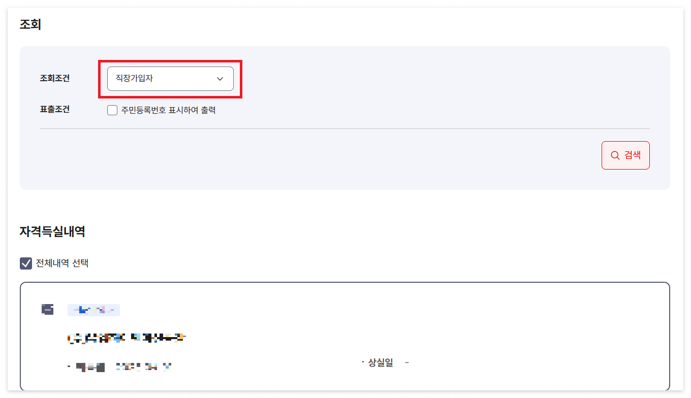 - 조회 구분: 직장인이라면 **'직장가입자'**를 선택하세요. (이전에 지역가입자였던 이력까지 모두 필요하다면 '전체'를 선택해도 무방합니다.)