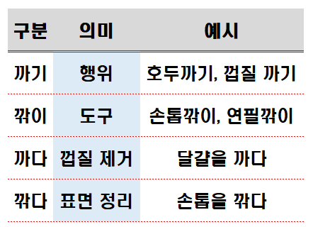 가장 먼저 살펴볼 것은 어근이 되는 동사 ‘까다’와 ‘깎다’의 의미적 차이입니다. 한국어 동사는 동작의 대상과 방식에 따라 엄격히 구분됩니다.