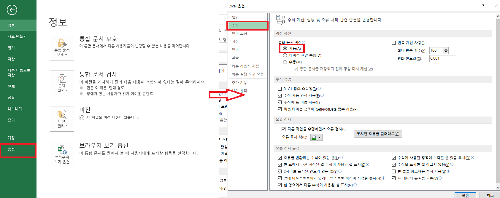 메뉴->옵션->수식 으로 들어가서 통합 문서 계산에 자동으로 체크를 하고 확인 버튼을 누르면 끝이다.