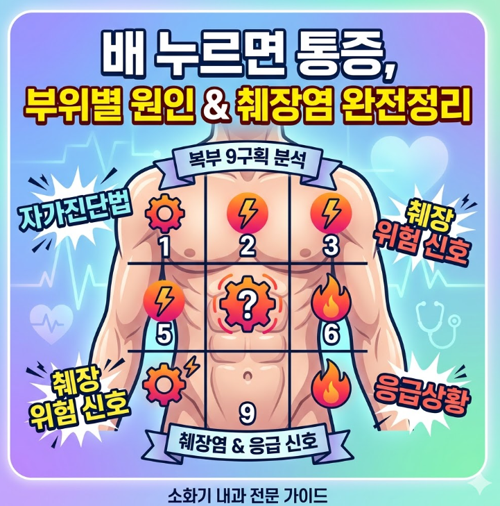 안녕하세요. 일상 속에서 갑자기 배가 콕콕 쑤시거나, 특정 부위를 눌렀을 때 통증이 느껴진 경험 있으시죠? 단순 소화불량인지, 병원에 가야 할 신호인지 헷갈릴 때가 많습니다.오늘은 복부 9구획 기준 통증 원인 + 췌장 질환 신호 + 응급 판단 기준까지 핵심만 정확하게 정리해드립니다.1. 복부 9구획으로 보는 통증 위치별 원인복부는 의학적으로 9개 구역으로 나눠 진단합니다. 통증 위치만으로도 상당 부분 원인 추정이 가능합니다.✔ 상복부 (명치 라인)우상복부: 간·담낭→ 담석증, 담낭염 의심 (식후 악화 + 오른쪽 어깨 방사통)중상복부(명치): 위→ 위염, 위궤양, 역류성 식도염좌상복부: 위 끝·비장→ 드물게 췌장염 초기✔ 중복부 (배꼽 라인)좌우 옆구리: 신장·요로→ 요로결석 (극심한 통증 + 등까지 확산..